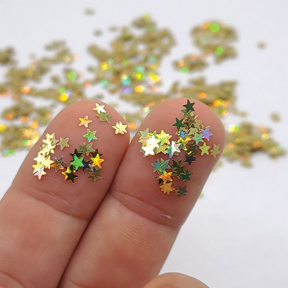 These gold holographic glitter confetti stars really stand out. Apply them around the eyes, cheeks, face, body, or hair. Use our Colorloc Adhesive Gel for the eyes and face. For the body, you can use a lotion of your choice.